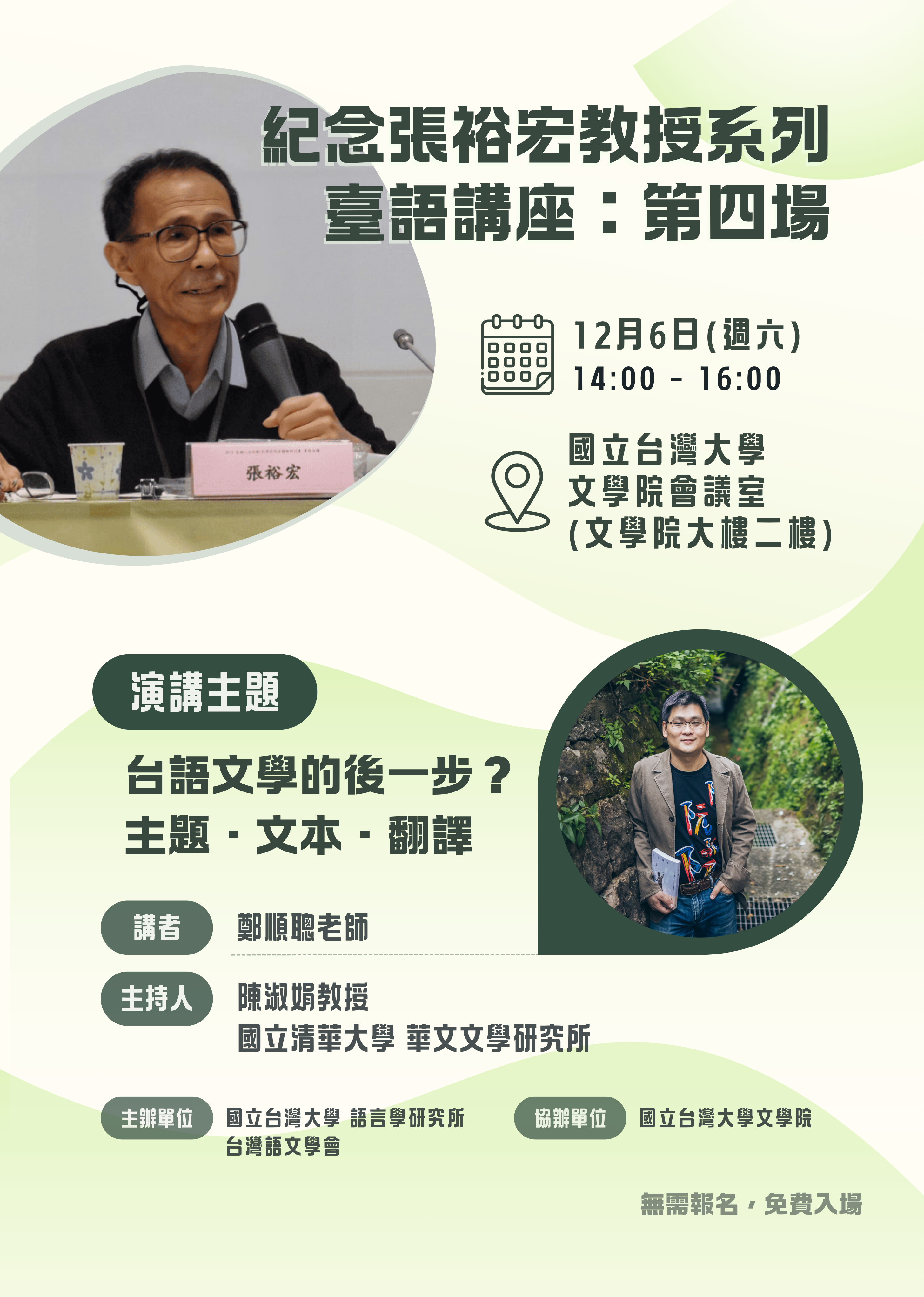 內容:用臺灣台語來創作的文學作品,佇標準化徛予在、語言意識漸覺醒、民間和政府相牽挽之下,會當講是挽予旺勢閣時行,作品是愈來愈濟、那來那媠氣。佇2025年的上尾一月日,順聰欲越頭來看這五冬十冬的成果,舉有代表性的作品來討論,舉例開破,破出新的跤路——台語文學按怎來行後一步?主題和風格欲按怎楦闊?按怎借台文翻譯來做肥底,閣共台文作品翻出去,行向國際化?