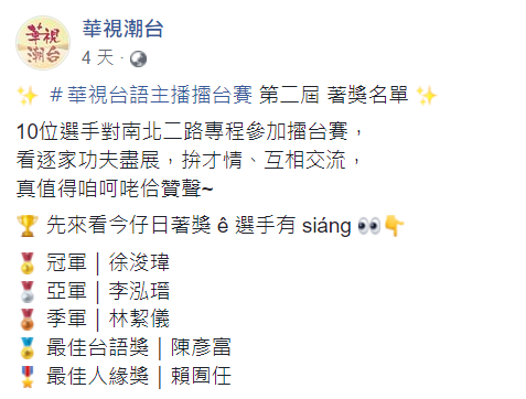 第一屆華視台語主播擂台賽【冠軍】宋展旭也是本系優秀學生(大學/碩士班皆就讀本系)