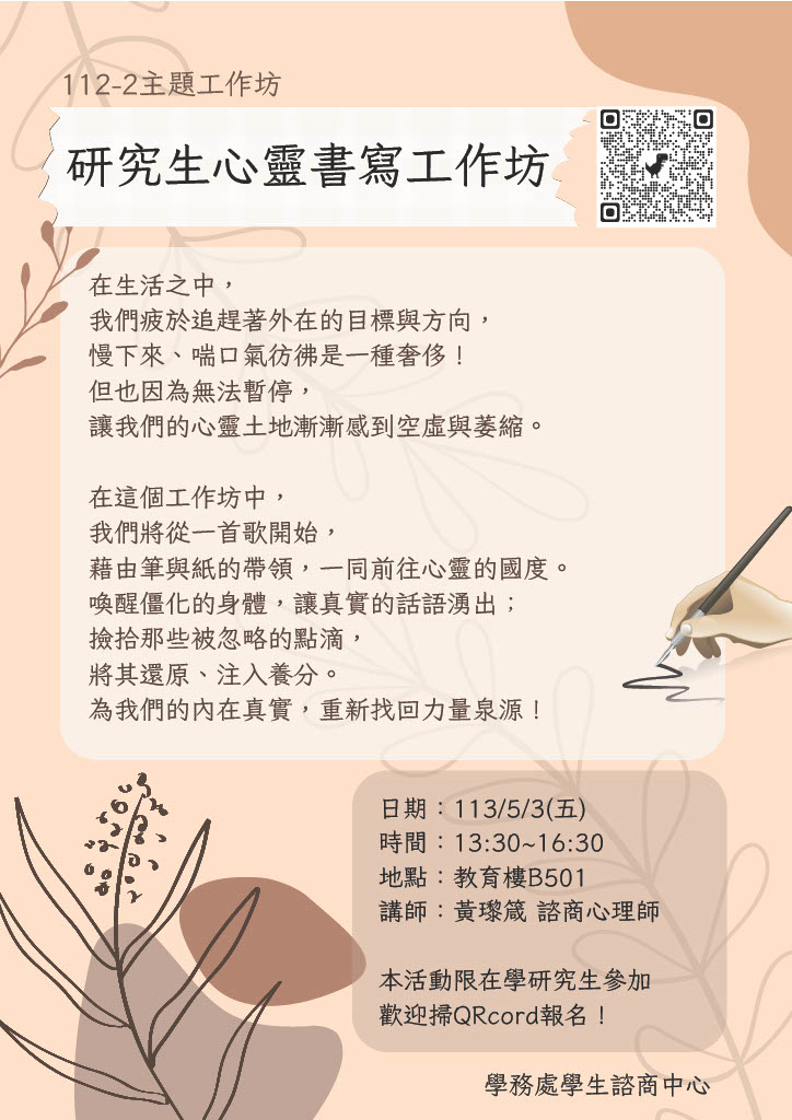★諮商中心將於5/3 下午13:30- 16:30 教育樓B501,為本校研究生辦理心靈書寫工作坊,目前尚有名額,非常歡迎有興趣的研究生報名參加。