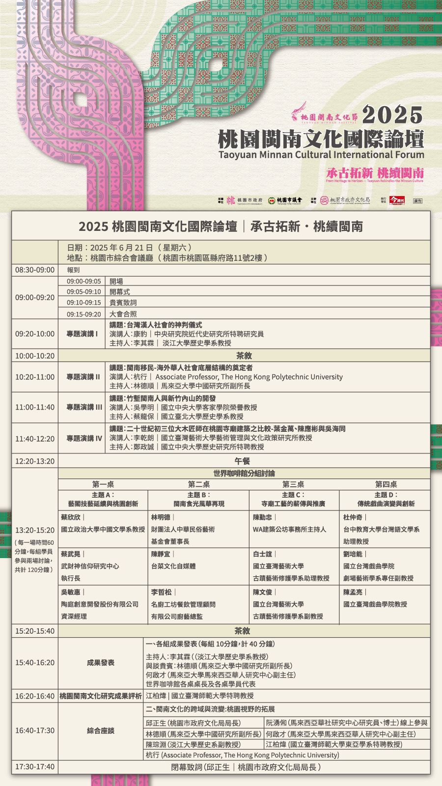 一、旨揭國際論壇以「承古拓新.桃續閩南」為主軸,預計於 114年6月21日 (六)9時至18時,假桃園市綜合會議廳辦理,邀請桃園與國際學者、職人及文化推手與會,聚焦閩南文化的歷史軌跡,連結當代桃園的創意實踐及全球脈 絡。