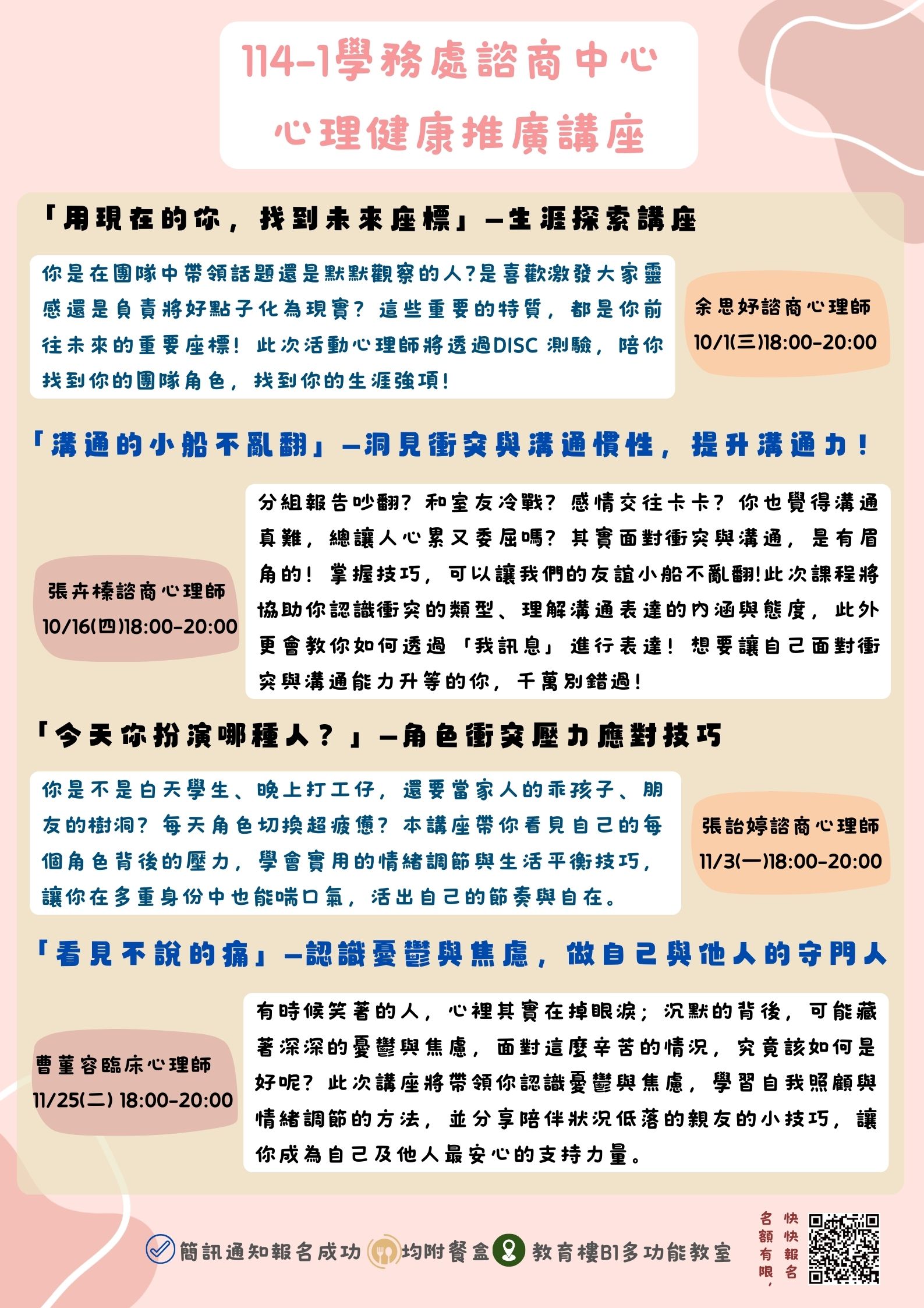 主題分別為生涯探索、人際溝通、自我探索及認識憂鬱與焦慮