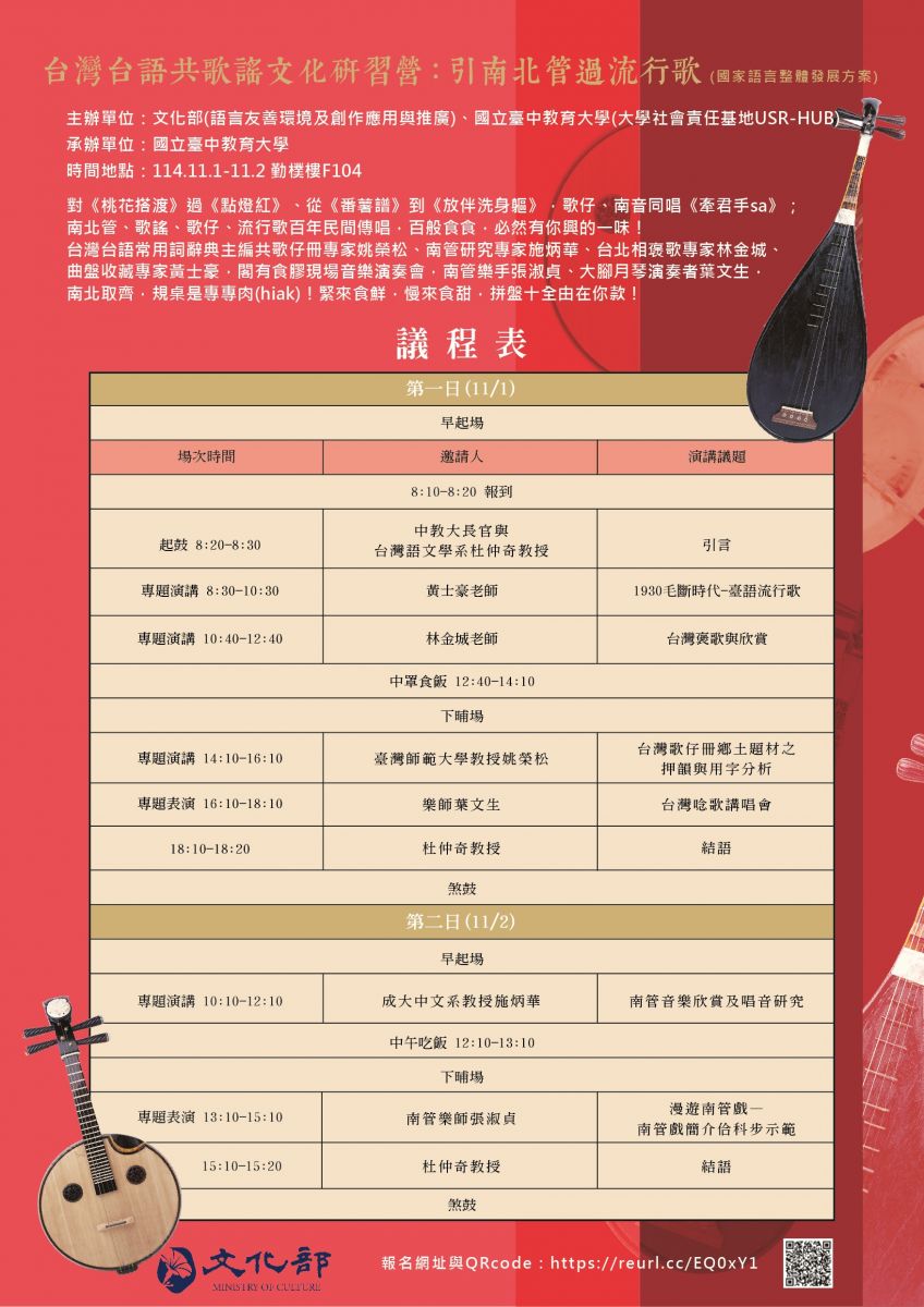 本系於114年11月1日與11月2日,假F104舉辦「台灣台語共歌謠文化研習營:引南北管過流行歌(國家語言整體發展方案)」,敬請踴躍報名參加!(詳細請點入尾端報名網站)