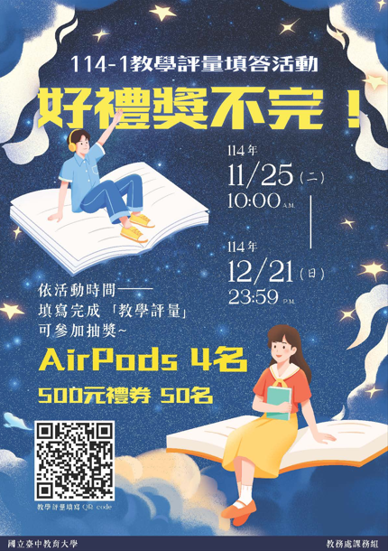 114學年度第1學期教學評量填答活動資訊如下,歡迎本學期有修課的同學踴躍填答唷~
