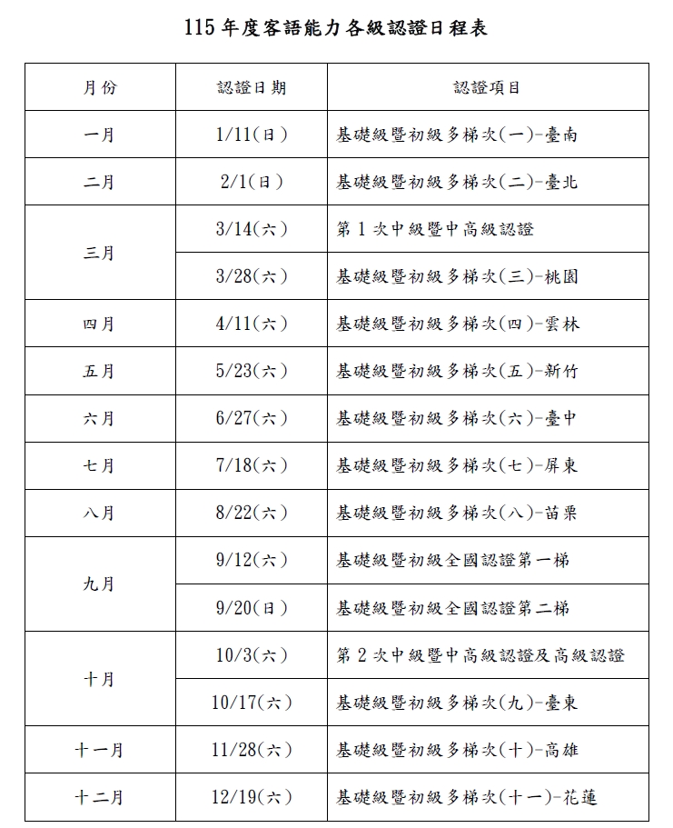 【轉知】客家委員會「115年度客語能力各級認證日程表」