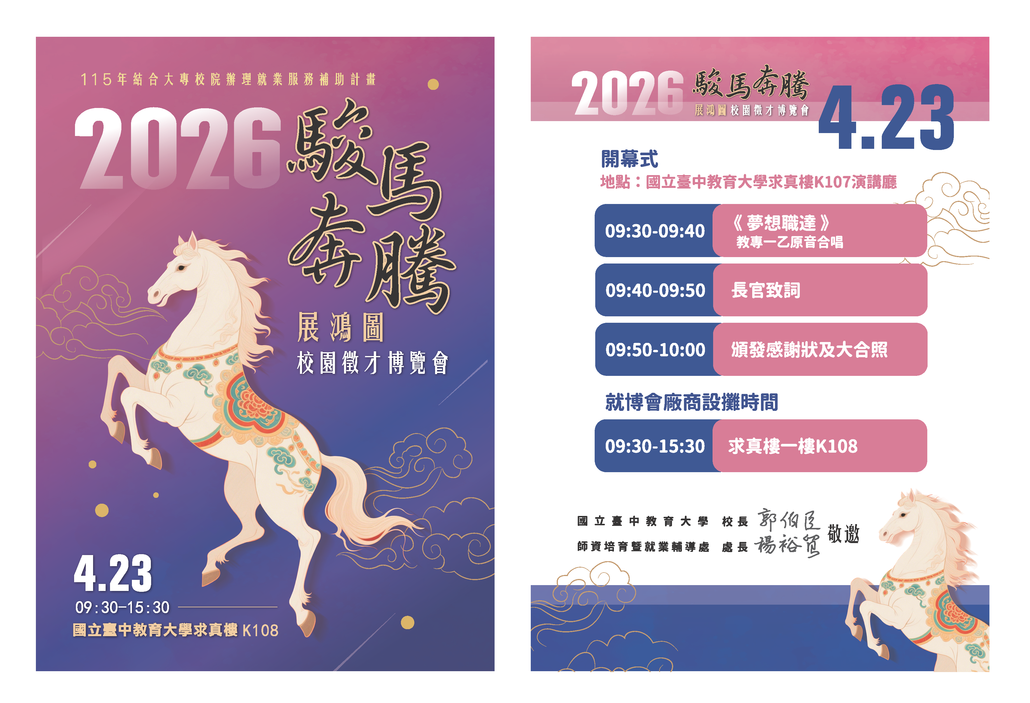 一、本校將於4月23日(四)9:30-15:30在求真樓K108舉辦「2026駿馬奔騰展鴻圖校園徵才博覽會」。