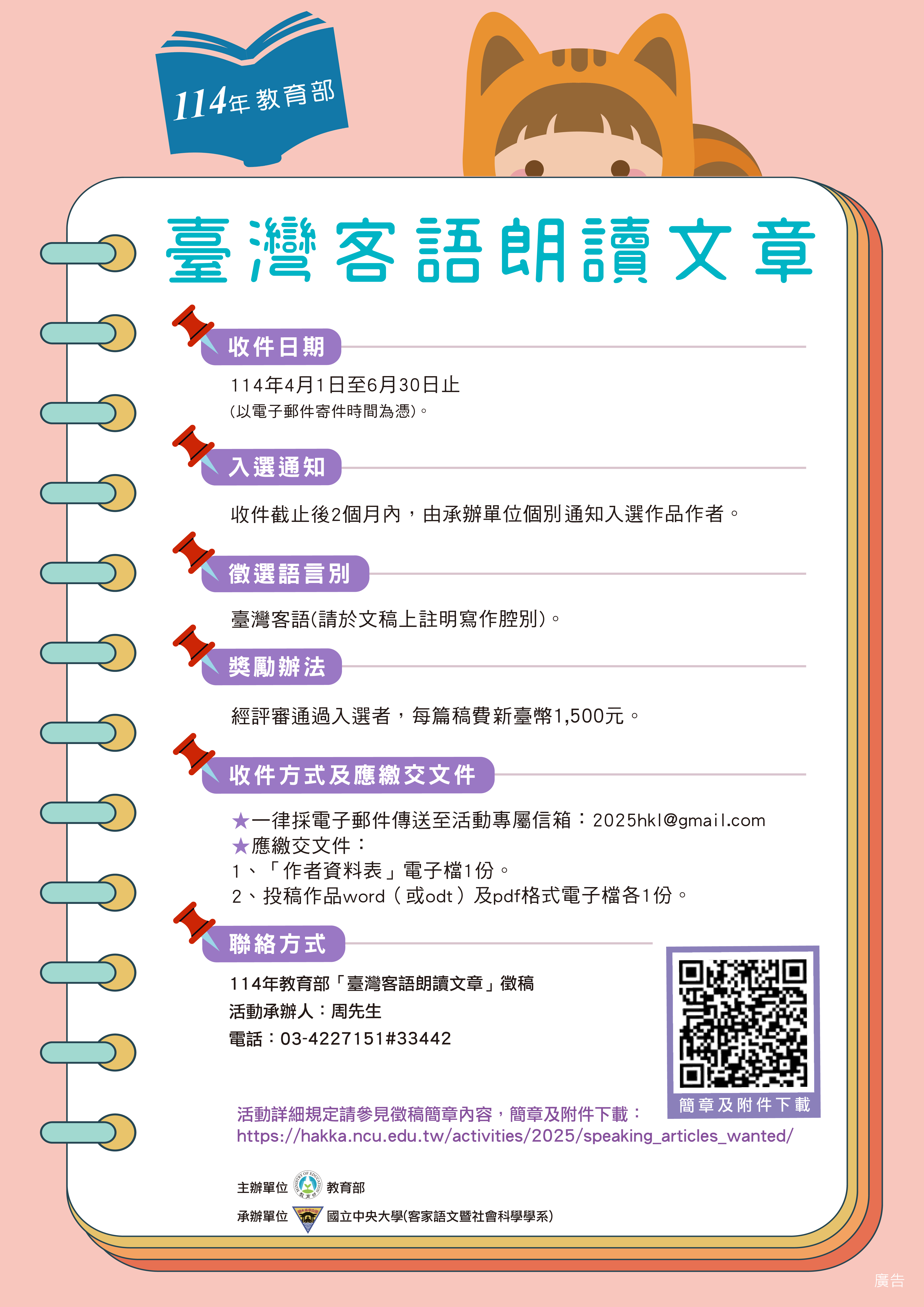 附「活動簡章」、「徵稿公告」,相關資訊請參見活動網頁(https://hakka.ncu.edu.tw/activities/2025/speaking_articles_wanted/)。