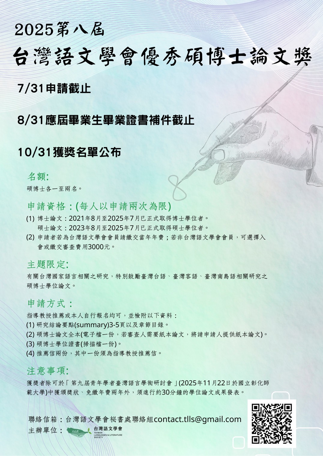 九、獲獎者將於「第九屆青年學者臺灣語言學術研討會」(2025年11月22日於國立彰化師範大學)中獲頒獎狀,並進行約30分鐘的學位論文成果發表。