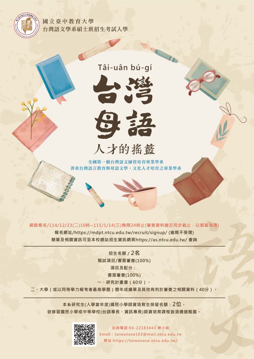 6. 聯絡信箱:adm@mail.ntcu.edu.tw (教務處);taiwanese103@mail.ntcu.edu.tw (台語系陳小姐)
