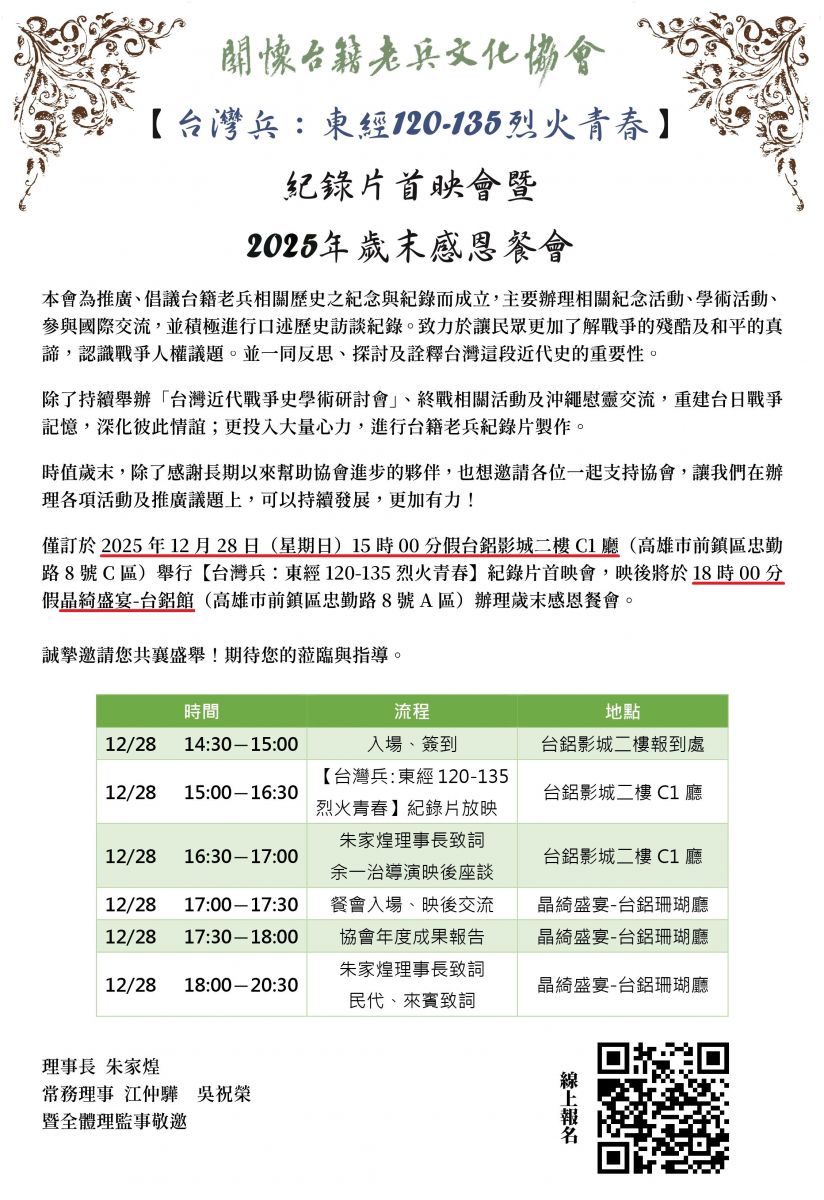 僅訂於2025年12月28日(星期日)舉辦紀錄片首映及感恩餐