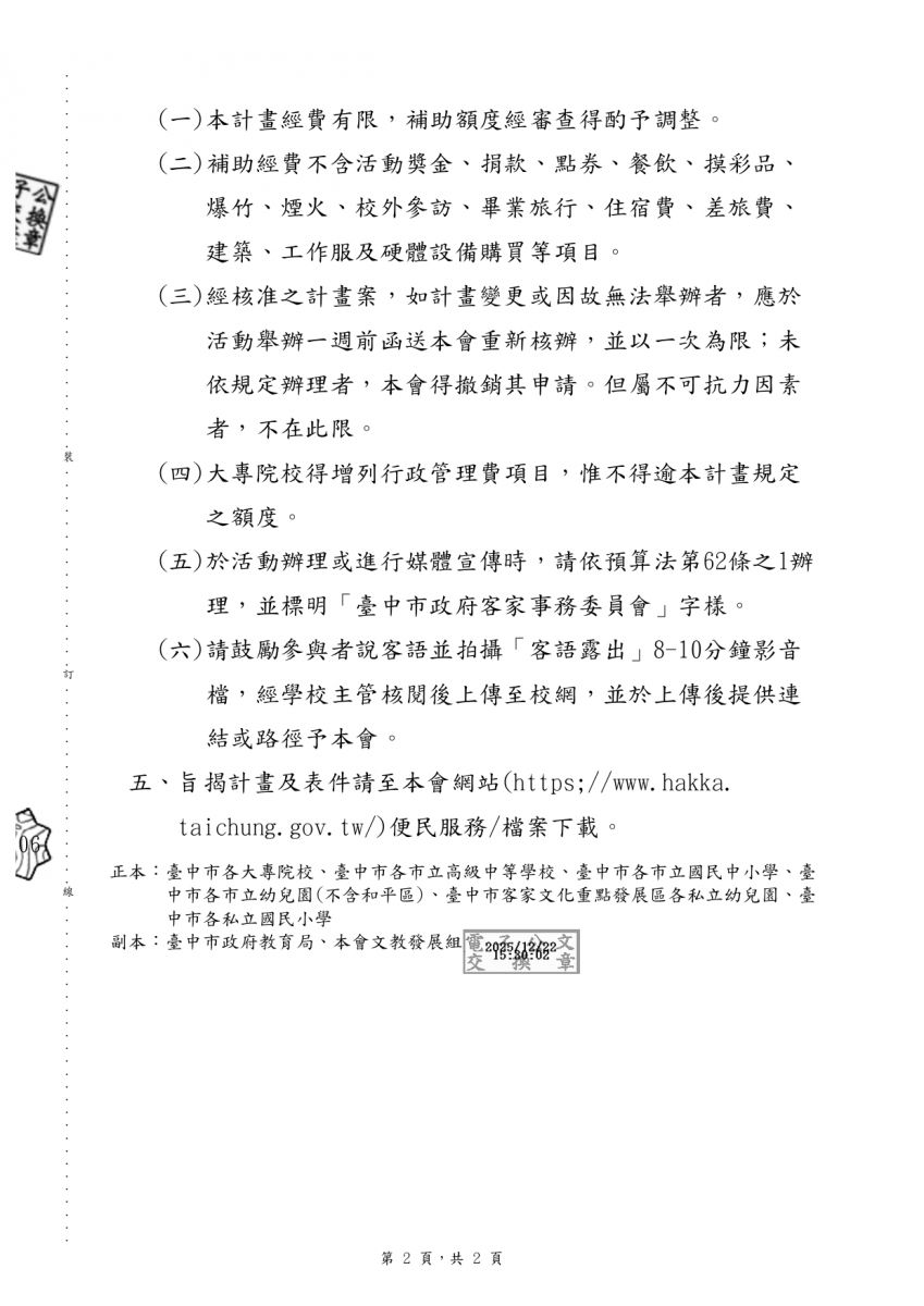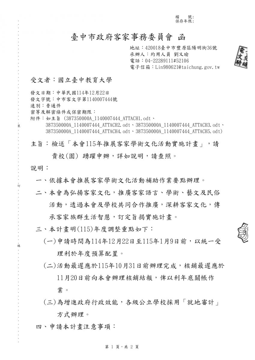 115年推展客家學術文化活動實施計畫」,請踴躍申辦,詳如說明。