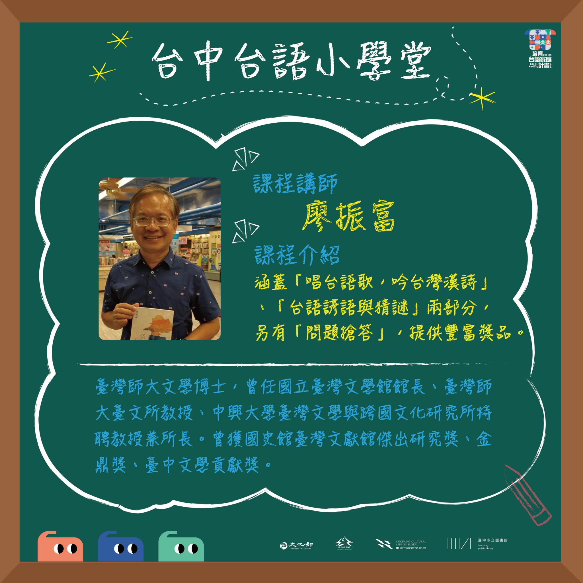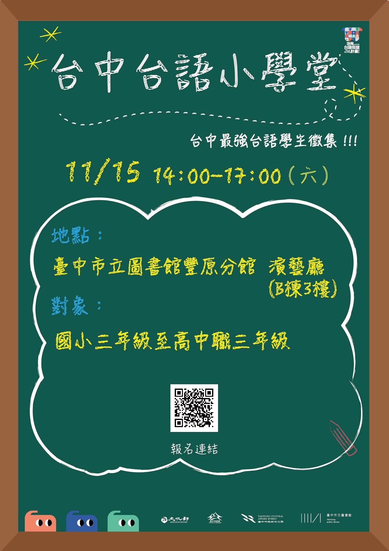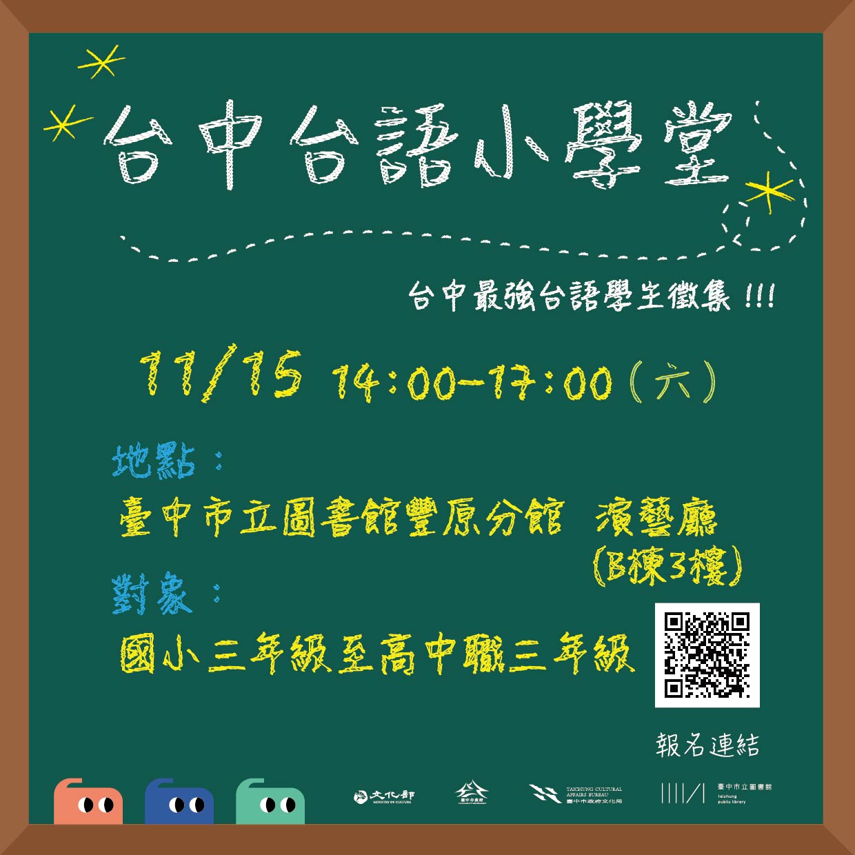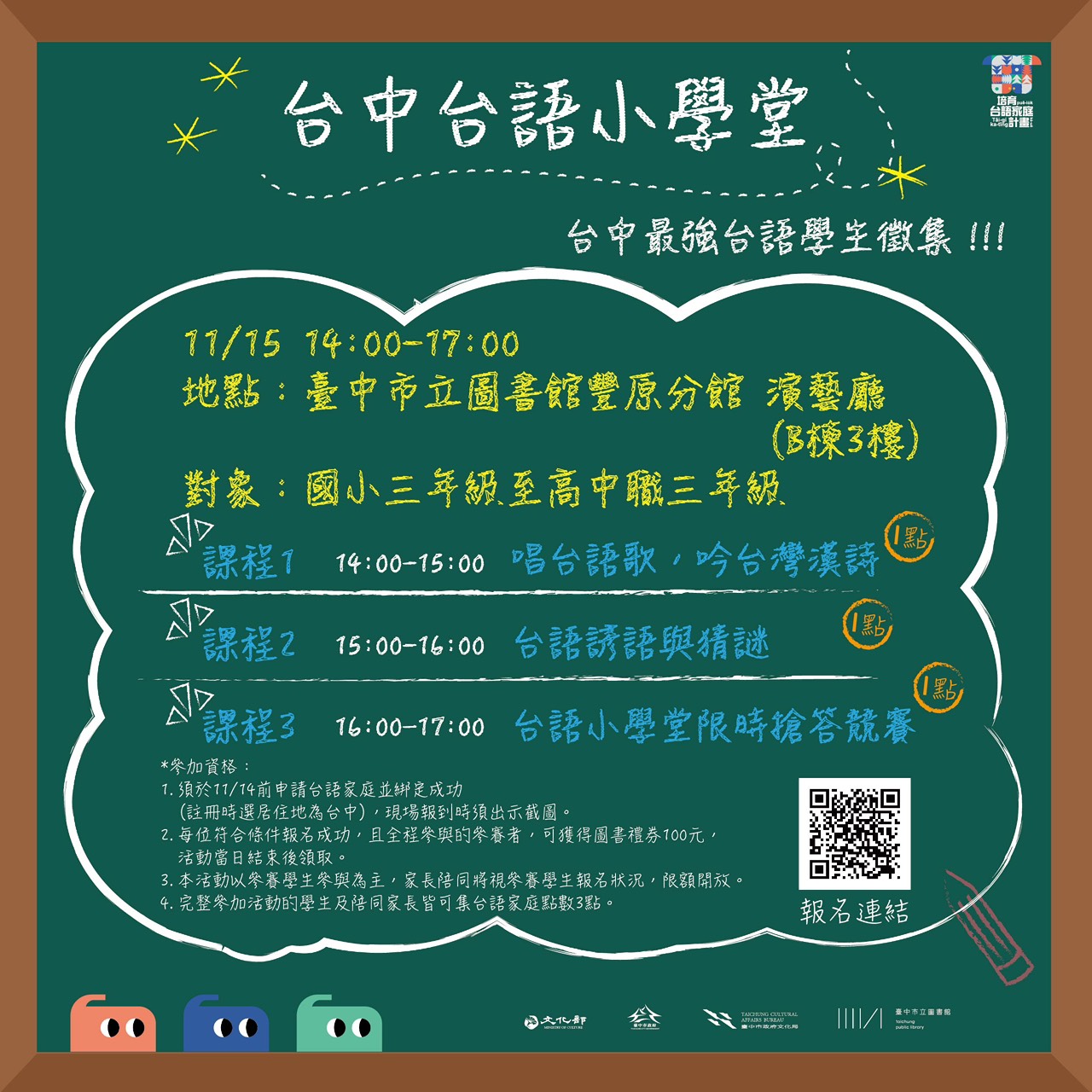 二、旨揭活動於114年11月15日(六)14時至17時於臺中市立圖書 館豐原分館3樓演藝廳(B棟3樓)辦理,參加資格為國小三年 級至高中職三年級學生,並須於11月14日前申請台語家庭 並綁定成功(註冊時選居住地為臺中)之家庭。詳細活動資 訊請參考附件海報、圖卡及臺中巿立圖書館活動網站: https://gov.tw/soJ
