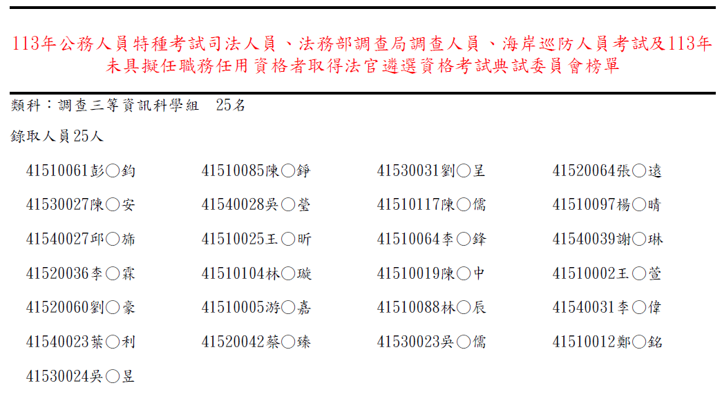 【公職】賀! 本系110級系友蔡O臻錄取113年「法務部調查局調查人員」資訊科學組三等