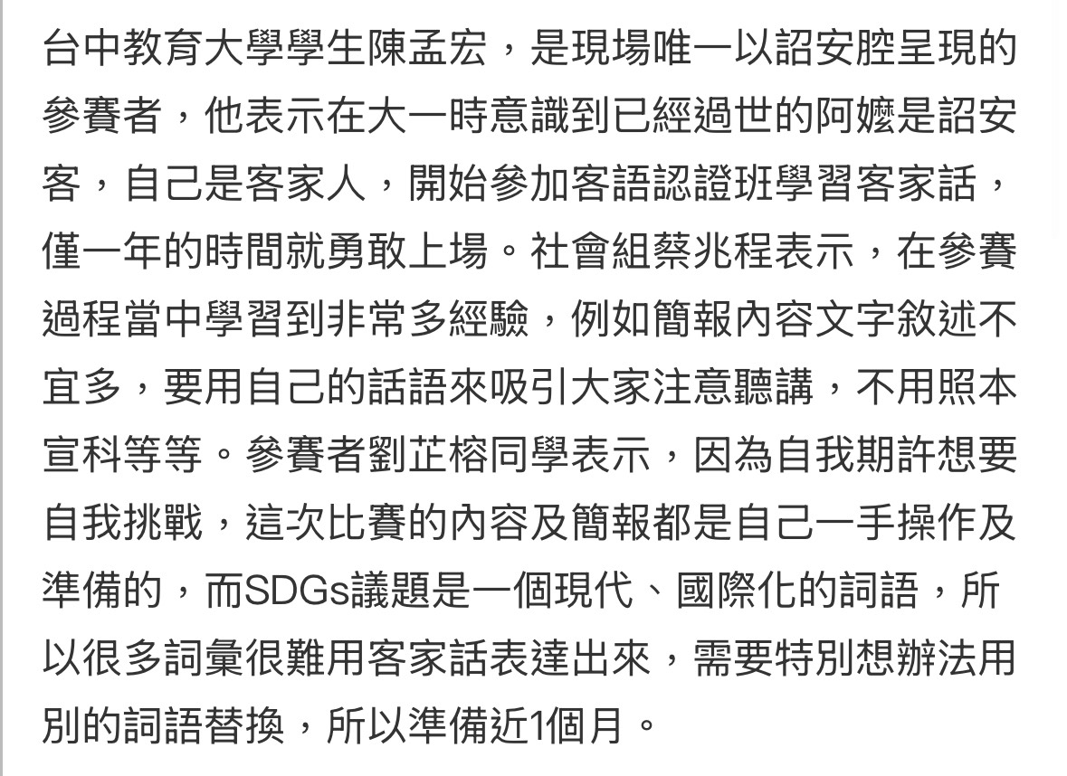 台中教育大學學生陳孟宏,是現場唯一以詔安腔呈現的參賽者,他表示在大一時意識到已經過世的阿嬤是詔安客,自己是客家人,開始參加客語認證班學習客家話,僅一年的時間就勇敢上場。社會組蔡兆程表示,在參賽過程當中學習到非常多經驗,例如簡報內容文字敘述不宜多,要用自己的話語來吸引大家注意聽講,不用照本宣科等等。參賽者劉芷榕同學表示,因為自我期許想要自我挑戰,這次比賽的內容及簡報都是自己一手操作及準備的,而SDGs議題是一個現代、國際化的詞語,所以很多詞彙很難用客家話表達出來,需要特別想辦法用別的詞語替換,所以準備近1個月。